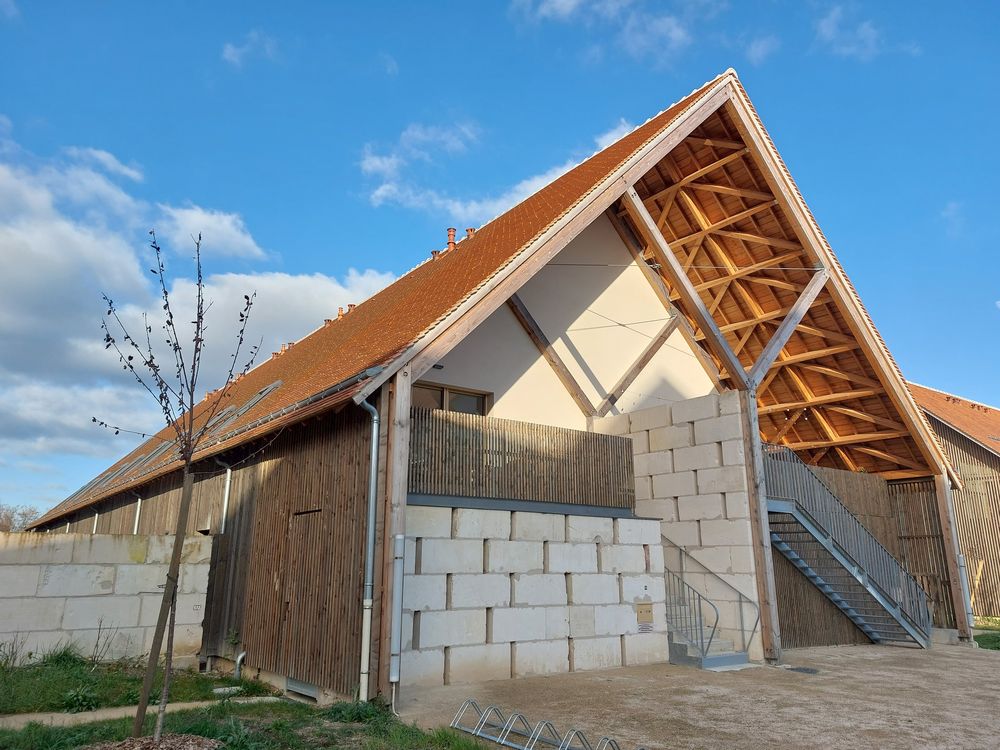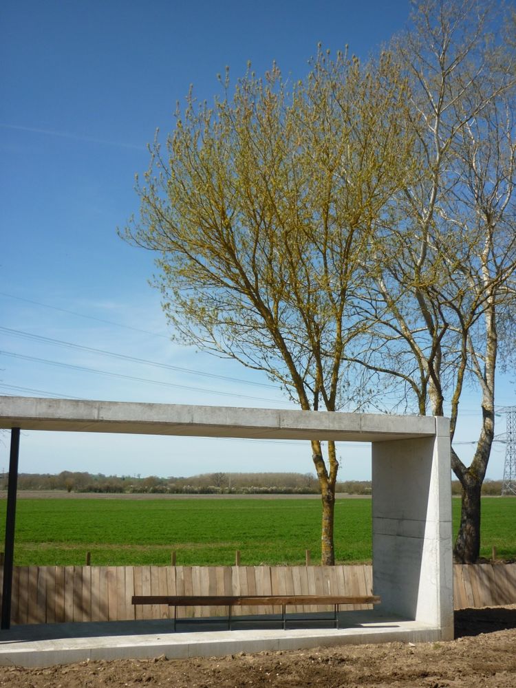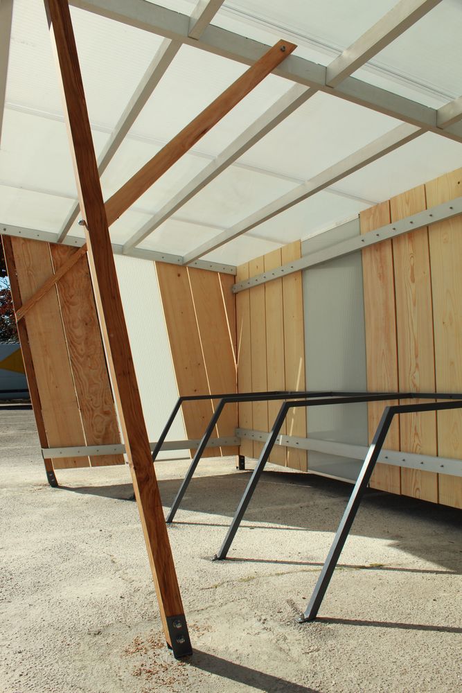 Jeu de lignes (verticales et diagonales), jeu de lumières (opaque et translucide) et jeu de matières (bois, métal, béton), nous invitent sous cet abris à vélo à la frontière du trompe l'oeil. Profilés aluminiums, plaques de polycarbonate alvéolaires, poteaux en chêne et planches de pin issus du réemploi s'allient pour créer un espace accueillant au design sobre et dynamique.