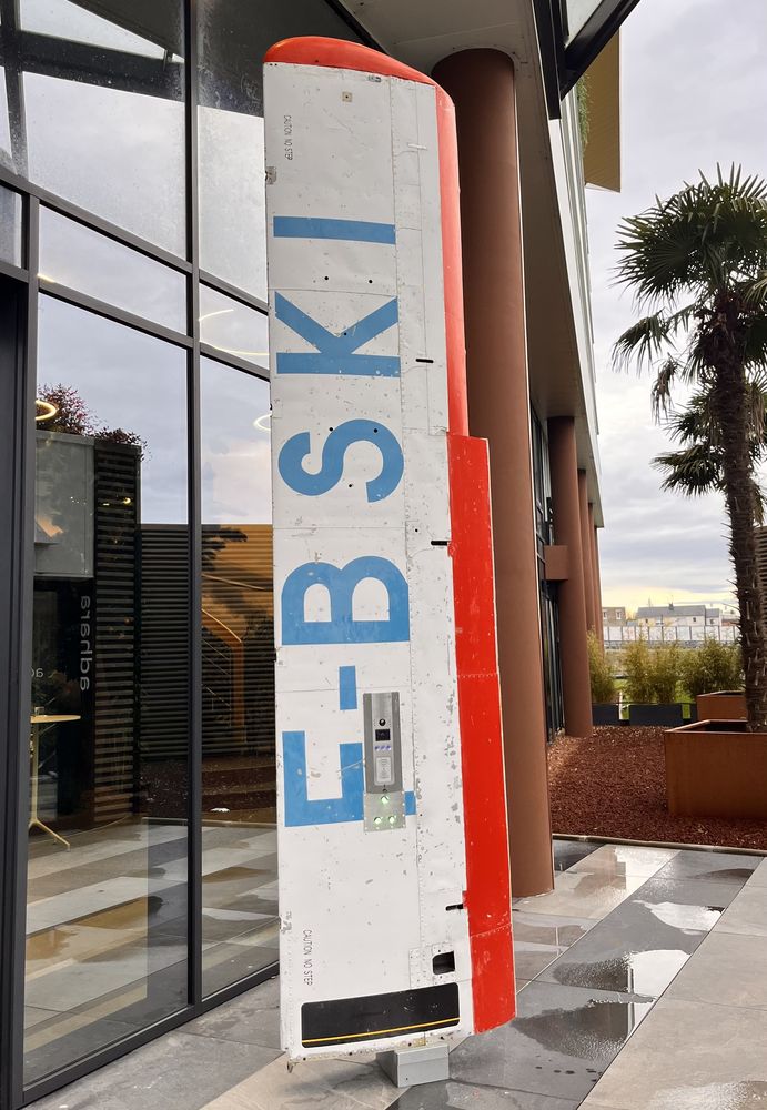 Nous avons donné une seconde vie à une aile d'avion en la transformant en interphone à l'entrée de notre bâtiment. Un symbole de voyage et de communication revisitée.