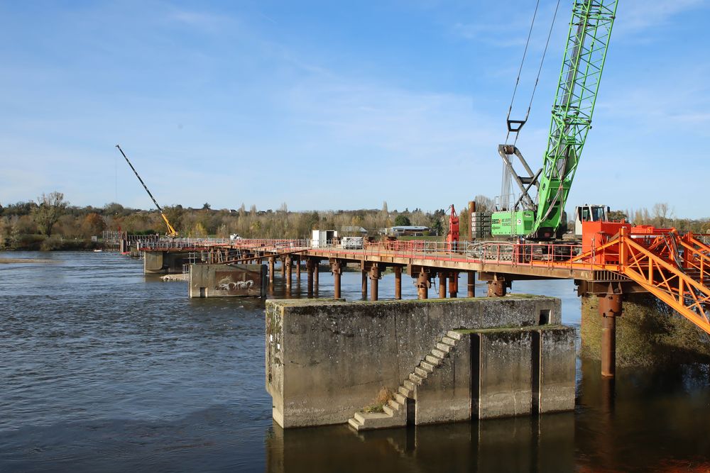 Suite à l'abandon d'un barrage sur la Loire démontable qui permettait d'avoir un plan d'eau de loisirs nautiques, car il était devenu financièrement irréparable, il a été décidé de réutiliser, après renforcement, les éléments en béton situés dans le lit du fleuve pour en faire les piles d'appui d'une passerelle de franchissement du fleuve pour les piétons, les vélos et les chevaux. Le chantier de renforcement vient de démarrer.