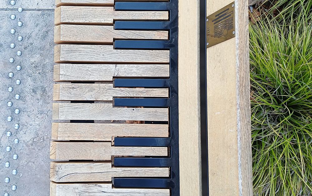 Un piano pour s’assoir. Ce banc issu du réemploi, conçu par l’atelier TAC, nous offre une pause urbaine à l’écoute de la place qui l’accueille. Ainsi, cette modulation évoque aussi bien ce changement de tonalité musicale urbaine que la modularité du bois réutilisé devenu banc. Cette partition visuelle nous montre alors en contrepoint une superposition de voix indépendantes s’ouvrant sur une note grise bitumée, suivi du matériau bois recyclé pour une cadence finale végétale.