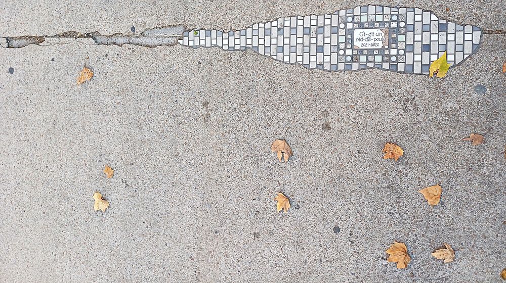 Cette épitaphe minérale grave dans le béton une nébulosité filante, crépuscule d’une faille urbaine. Œuvre d’Ememem, ce «flacking» qu’il perçoit comme «ses pansements pour trottoir (qui) mettent en lumière les blessures du tissu urbain» s’inspire du kintsugi japonais, l’art de réparer en sublimant. Les feuilles d’automne ajoutent comme un dernier éclat du vivant à l’image d’une pluie de larmes végétales issue de ce nuage de mosaïques ternes magnifiant cette déchirure du passé.
