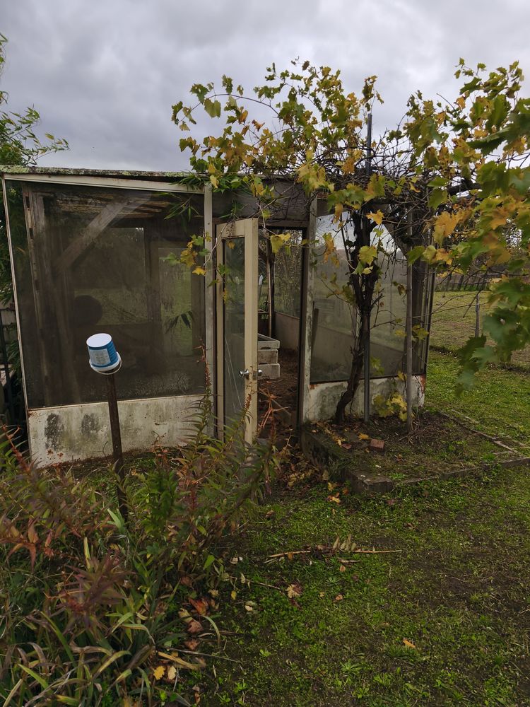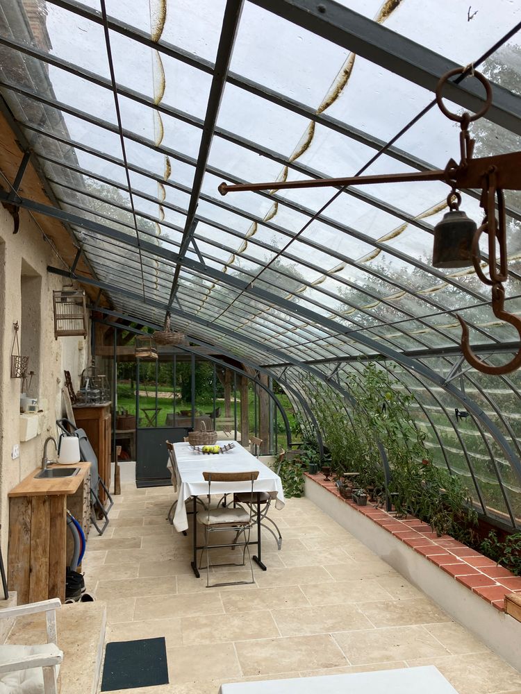 Récuperation et démontage d'une ancienne serre horticole pour en faire une verrière adossée à la maison.