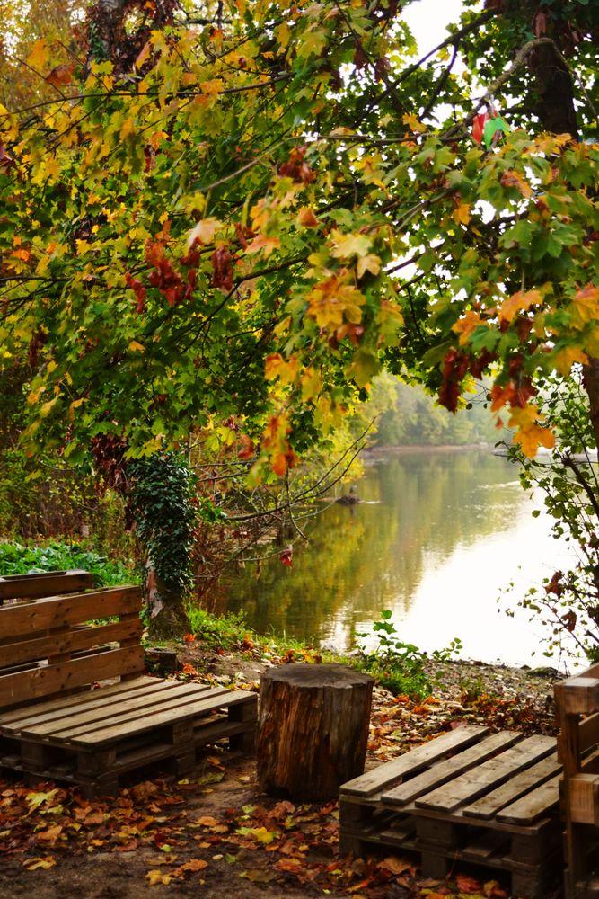 Une image qui illustre l’esprit du matériau de réemploi dans notre vie courante. On y voit un petit coin de détente aménagé au bord du loiret, avec des bancs et tables fabriqués à partir de palettes en bois recyclées. Ce type de mobilier, simple et fonctionnel, montre comment on peut donner une seconde vie à des matériaux destinés à être jetés, tout en réduisant les déchets et en préservant les ressources naturelles. Dans ce cadre naturel, le bois réemployé s’intègre harmonieusement à l’environnement, rappelant que écologie et créativité peuvent aller de pair.