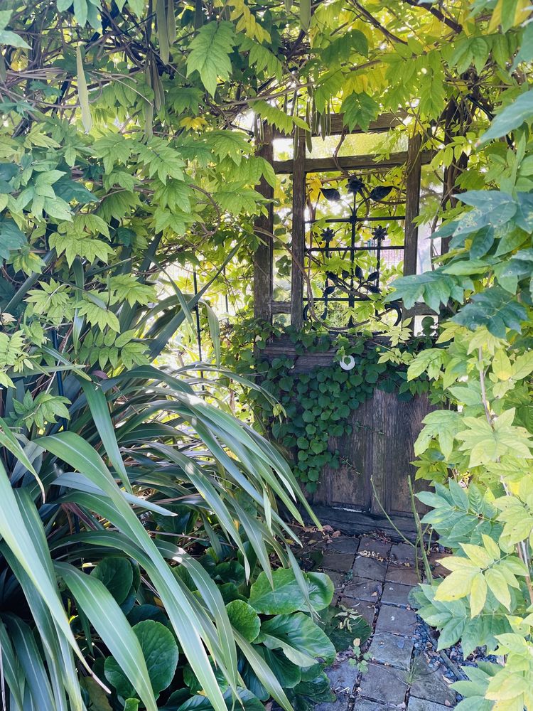 Une vieille porte de maison d'un aïeul a été recyclée pour habiller le jardin familial. Cette porte a une histoire. L'histoire continue. Elle donne désormais accès à un ailleurs ; libre à chacun d'imaginer où elle peut mener... à chacun son paradis.