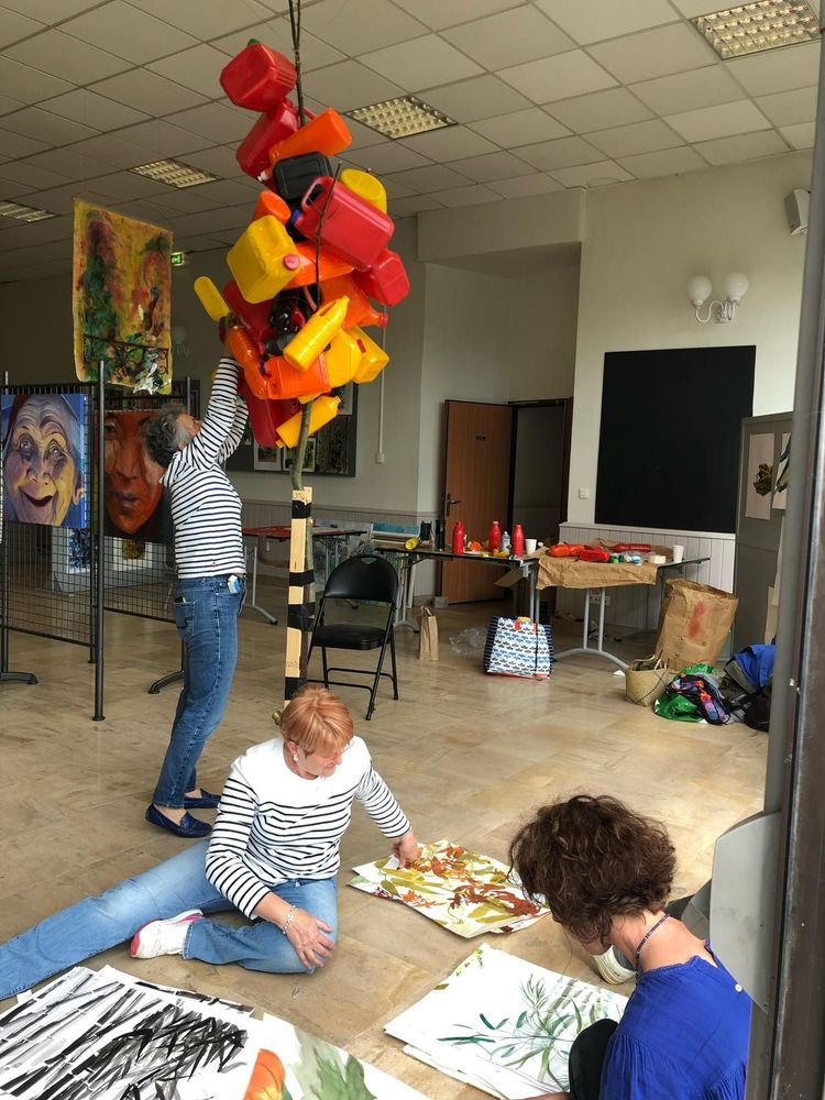 L'arbre à bidons a été réalisé à 6 mains par trois partenaires liées d'amitié après avoir participé à un stage d'expression artistique.