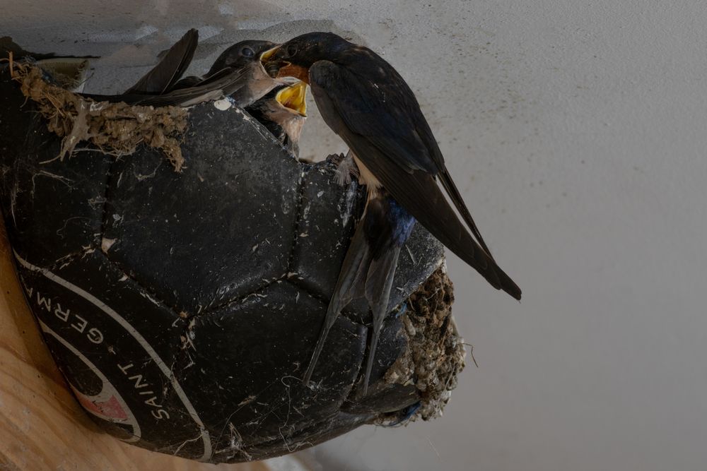À partir d'un ballon de foot cassé, nous avons construit un nid d'hirondelles qui, certes, n'a pas été adopté la première année, mais qui, depuis, a été occupé pour la deuxième fois de suite.