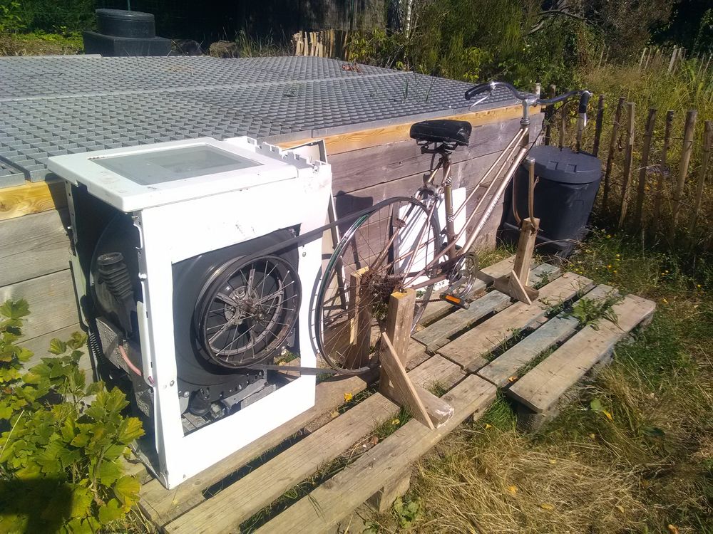 Après de multiples pannes et réparations, la dernière fut de trop ! Retour à la force manuelle en raccordant un ancien vélo au tambour du lave-linge. Le deuxième essai de transformation fut le bon. Du linge à tremper, une lessive à la cendre, et 15 minutes à pédaler pour laver, rincer, essorer avant séchage au soleil. L'occasion de prendre le temps de faire sa lessive en écoutant un podcast.