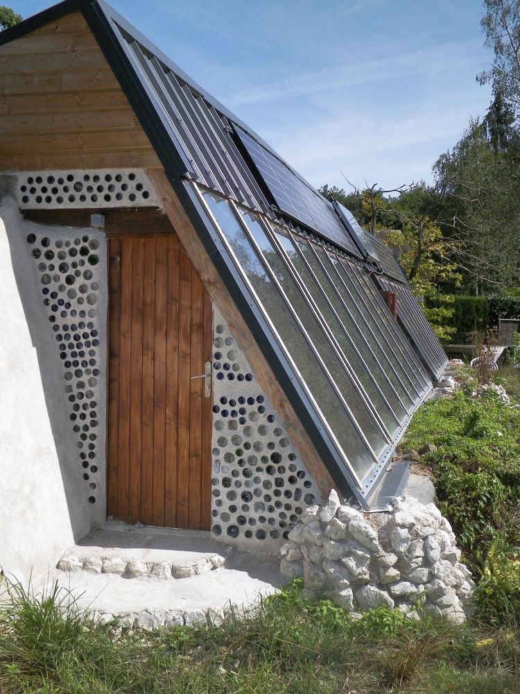 Mur composé de bouteilles, découpées et assemblées en "briques" dans un mur en terre-paille, recouvert de chaux. Maison de Ligny-le-Ribault (45) inspirée du modèle de "Earthship global".