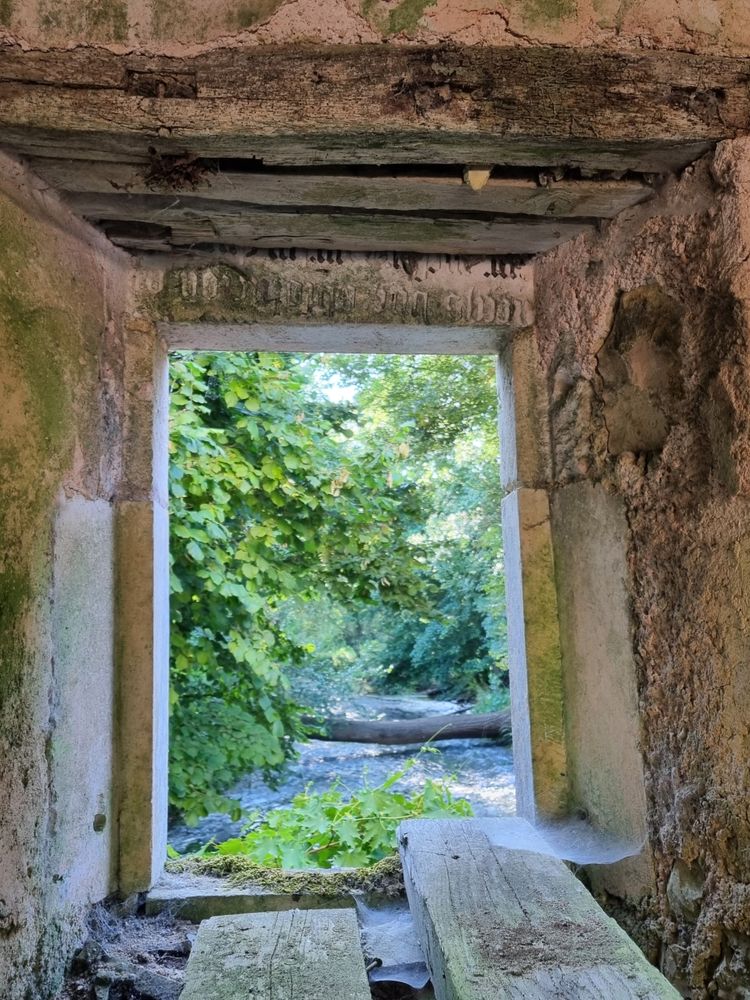 Pierre de réemploi scellée à l’envers, en écriture dite « gothique », gravée après la fin du XIIIe siècle. Les lettres étaient également peintes. Deuxième ligne : "…EQS UNE ABSOLUSION NI" Troisième ligne : "UR MESSIRE M(A)RTIN GU" La fenêtre est située au dessus de l’arc où passe la chute d'eau du bief qui alimentait les deux roues du Moulin de Vilaine. La fenêtre jumelle est également équipée d'un linteau en pierre de réemploi indiquant deuxième ligne "(les) SAMEDIS DE LAN PERPETUELLEMENT" et en troisième ligne "unE MESSE DE N(OST)RE DAME", ce qui laisserait à croire à une pierre, en deux parties, indiquant et commémorant une obligation, une fondation de messes tous les samedis perpétuellement à Notre Dame, la Vierge Marie, au sein d’un établissement ecclésiastique. Ce pourrait être une pierre tirée de l’abbaye de Déols, de la chapelle de Notre-Dame-des-Miracles construite à l'issue de la Guerre de Cent Ans. L'abbaye a été sécularisée au début du XVII° s. et cette chapelle a été complètement détruite à la fin du XVIII° s.